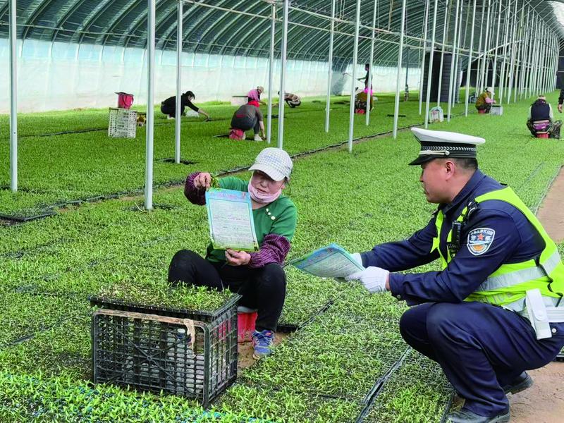 近日,乌拉特前旗交管大队公路巡逻一中队民辅警来到辣椒育苗大棚,通过发放宣传资料、面对面讲解等形式,重点向群众讲解出行安全注意事项。通过教育引导,使他们充分认识到交通违法行为的危害性和严重后果,进一步提高了群众的交通安全意识和自我防护能力。 本报通讯员 刘鑫 辛龙 摄