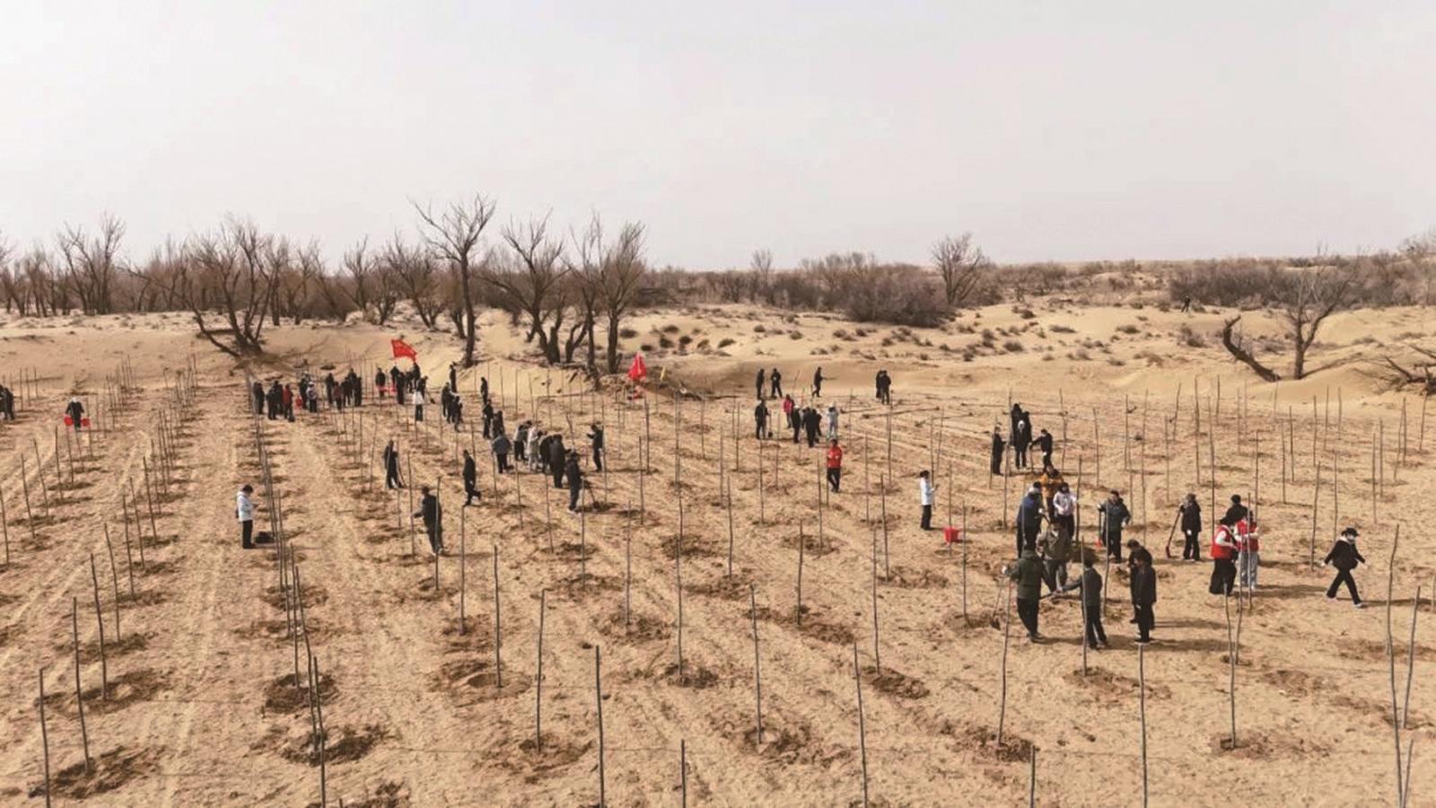 在乌兰布和沙漠东缘双庙镇继丰村段,500余名干部职工挥锹铲土、扶树正苗、培土压实、提桶浇水,每道工序都一丝不苟。经过大家的努力,共栽植新疆杨、沙枣、梭梭、杨柴等各类苗木3万余株,栽植面积达230亩,为改善生态环境贡献自己的力量。