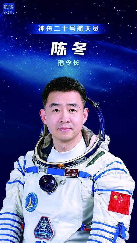 陈冬同志简历 陈冬,男,汉族,籍贯河南郑州,河南洛阳出生,硕士学位。1978年12月出生,1997年8月入伍,1999年4月加入中国共产党,现为中国人民解放军航天员大队大队长、特级航天员,陆军大校军衔。曾任空军某师某团飞行大队大队长,被评为空军一级飞行员。2010年5月入选为我国第二批航天员。2016年10月,执行神舟十一号载人飞行任务,同年12月,被中共中央、国务院、中央军委授予“英雄航天员”荣誉称号,并获“三级航天功勋奖章”。2022年6月,执行神舟十四号载人飞行任务,2023年3月,被中共中央、国务院、中央军委授予“二级航天功勋奖章”。经全面考评,入选神舟二十号载人飞行任务乘组并担任指令长。