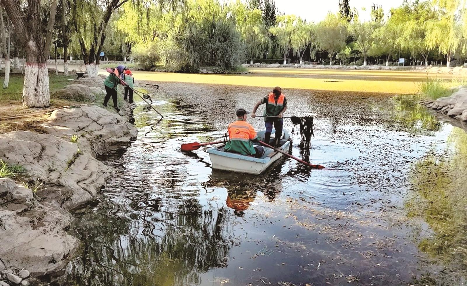 为维护水系景观效果及生态环境,近期,乌拉特后旗园林绿化服务中心积极开展水草集中打捞专项行动。 本报通讯员 范英 摄