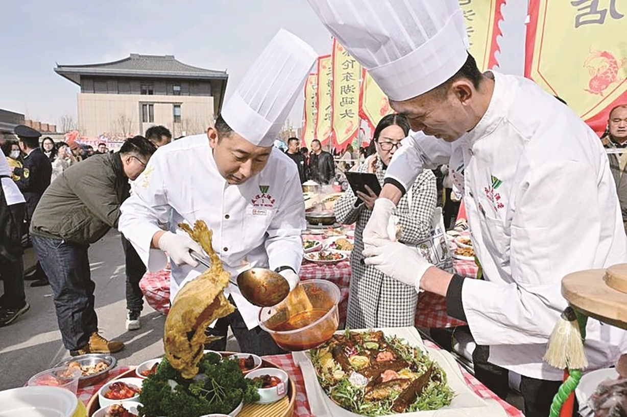 正午时分,“开锅纳福·全鱼宴展示品鉴”环节成为全场焦点,108道造型精致、色泽鲜亮的河套全鱼宴菜品集中亮相,身着传统服饰的演员上演“百戏敬鱼”穿行式表演,让现场市民游客在品味黄河开河鱼的同时,沉浸式感受传统饮食文化的魅力。