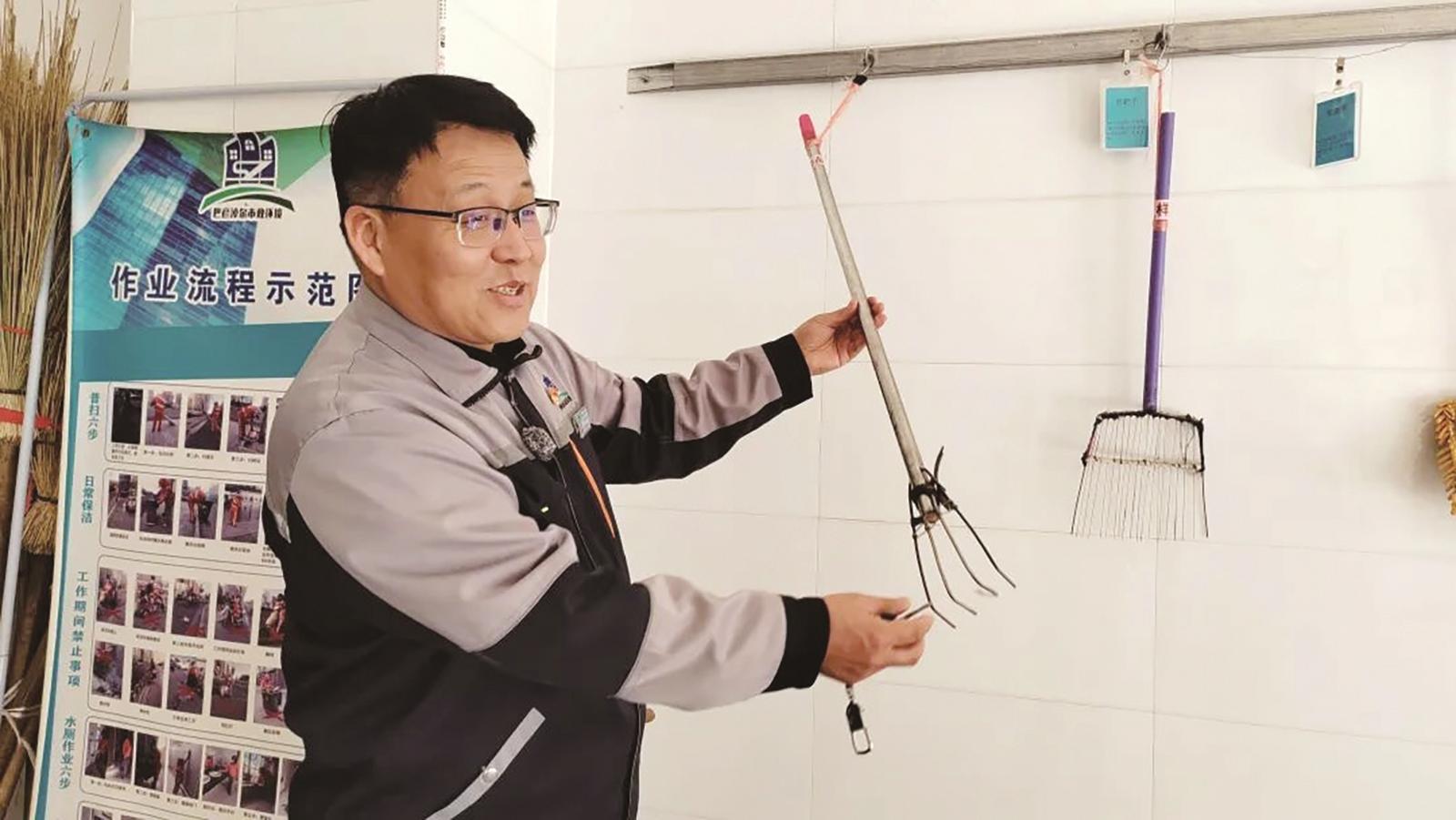 王磊展示环卫工人自制的工具