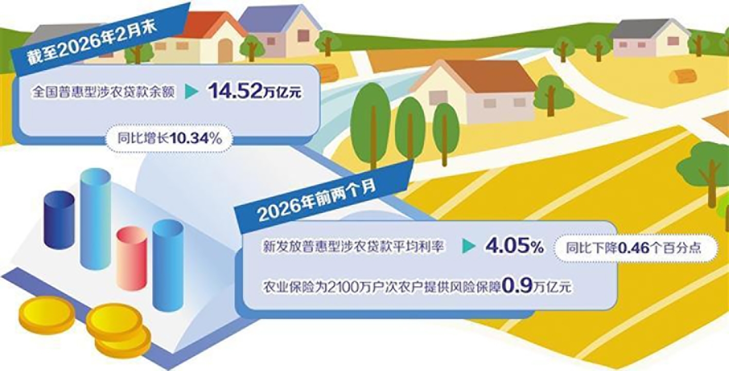 为深入贯彻落实今年中央一号文件的相关部署,《通知》提出要稳步增加涉农金融投入。专家表示,《通知》聚焦农业农村重点领域,将为乡村全面振兴提供有力支撑。数据显示,截至2026年2月末,全国普惠型涉农贷款余额14.52万亿元,同比增长10.34%;2026年前两个月新发放的普惠型涉农贷款平均利率4.05%,同比下降0.46个百分点。