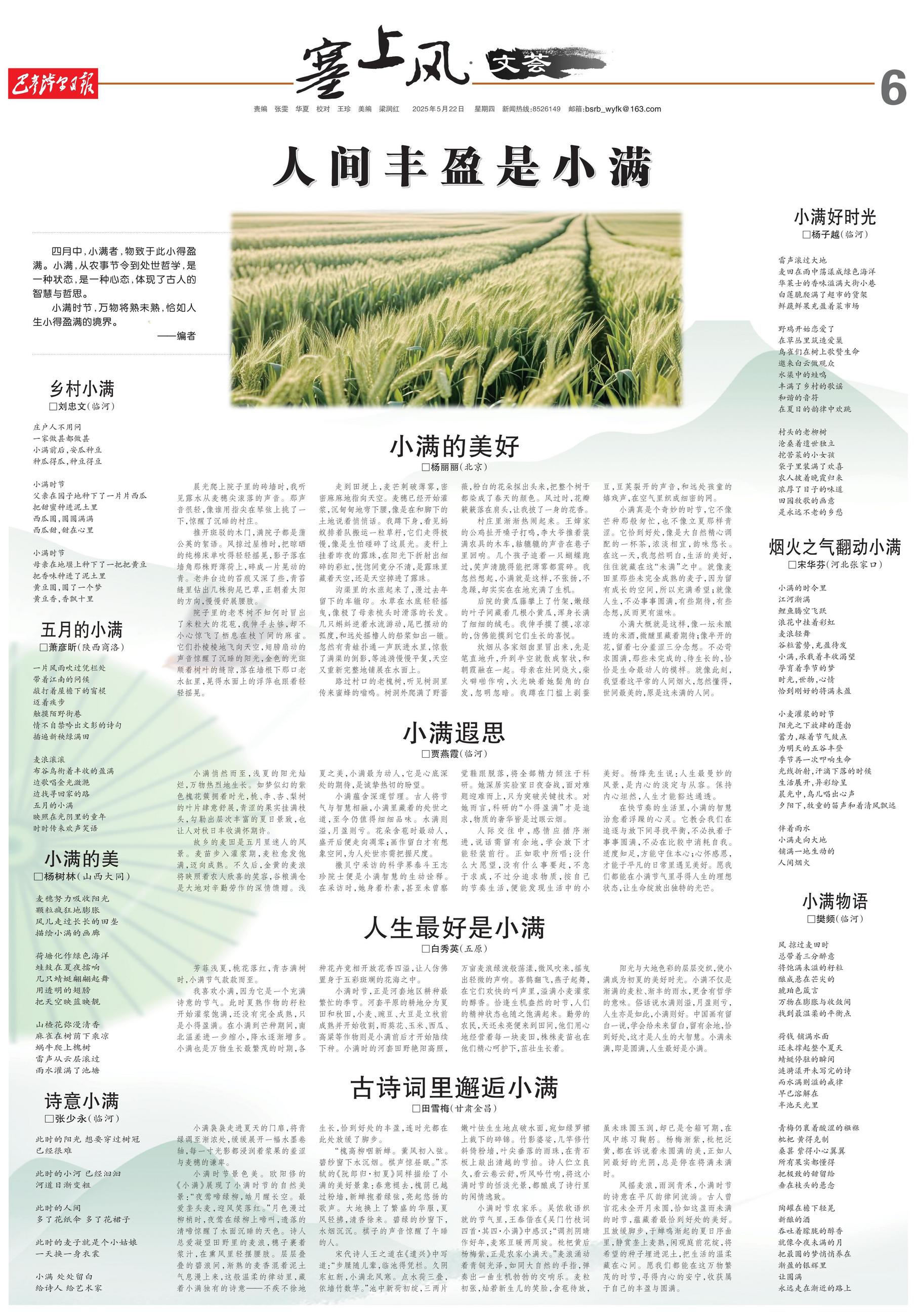 风摇麦浪,雨润青禾,小满时节的诗意在平仄韵律间流淌。古人曾言花未全开月未圆,恰如这盈而未满的时节,蕴藏着最恰到好处的美好。且放缓脚步,于蝉鸣渐起的夏日序曲里,静赏垄上麦熟,闲观庭前花绽,将希望的种子埋进泥土,把生活的温柔藏在心间。愿我们都能在这万物繁茂的时节,寻得内心的安宁,收获属于自己的丰盈与圆满。
